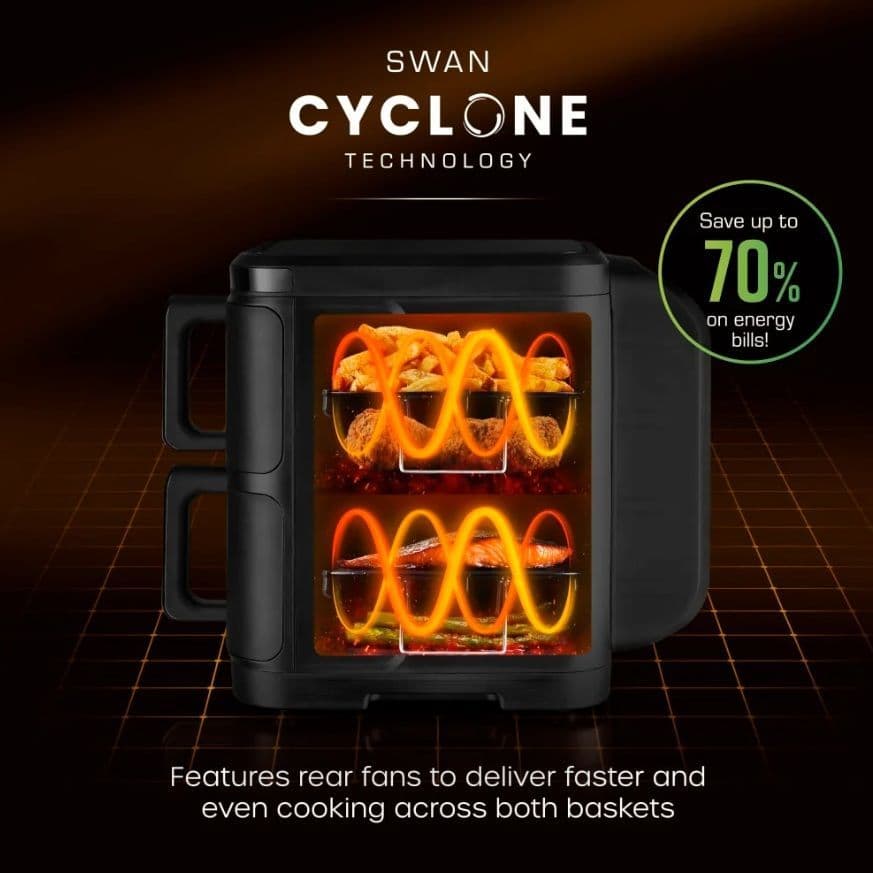 Swan’s unique Cyclone Cooking technology features rear fans to deliver faster and even cooking across both baskets. This saves up to 67% on your energy costs compared to conventional oven cooking.