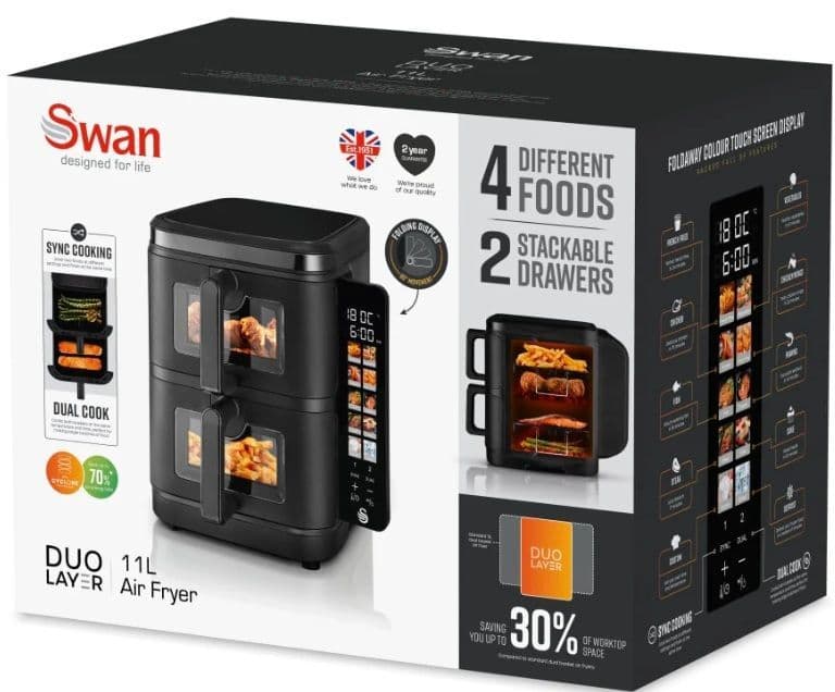 Looking to upgrade your single basket air fryer or thinking of a first time purchase but don’t have the worktop space? The Swan Duo Layer Air Fryer is what you need. Unlike standard dual basket air fryers, the baskets are stacked on top of each other, taking up 30% less worktop space. It has a large total cooking capacity of 11L, comprising two 5.5 litre baskets, each big enough to cook a whole chicken and make enough portions for a family of 8. This digital air fryer has a wealth of features, including Dual Cook that does both baskets at the same temperature and time for batch cooking or Sync for two ingredients at different settings to make the perfect meal. To make a fuss-free roast, easily quadruple your cooking capacity with the 2 included foldable cooking racks, giving you two extra layers in each basket to cook 4 different foods at once. This air fryer features energy efficient Swan Cyclone technology. With its rear fans, you get faster and even cooking across both baskets, giving you that deliciously crispy texture from frying, while saving up to 67% on energy costs compared to conventional oven cooking. The intuitive touch digital colour display lets you choose from 10 pre-set meal selections, adjust the temperature for manual frying and more with just one touch. The screen can then be neatly folded away to save you even more worktop space. Dual viewing windows let you easily check the progress of your food without stopping the air fryer mid cycle for more efficient cooking.